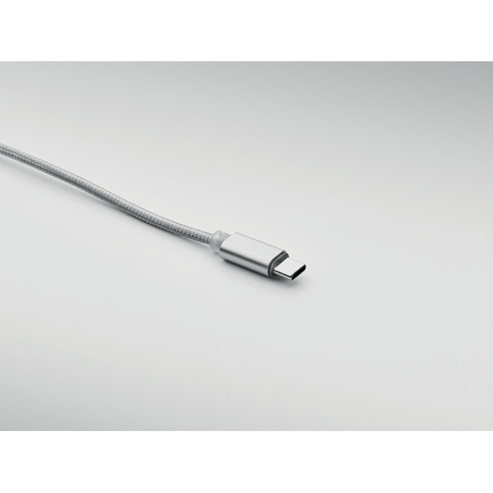 Charging cable in aluminium with input: 2-in-1 type-C & type-A and micro-B (2 in 1 pin), Type C and micro B output. Cable length: 120cm.