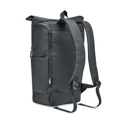 15 inch rolltop laptop backpack in 300D RPET polyester. Large zippered front pocket, hidden side pocket with small carabineer loop inside. The carabiner is not for climbing (non professional use).