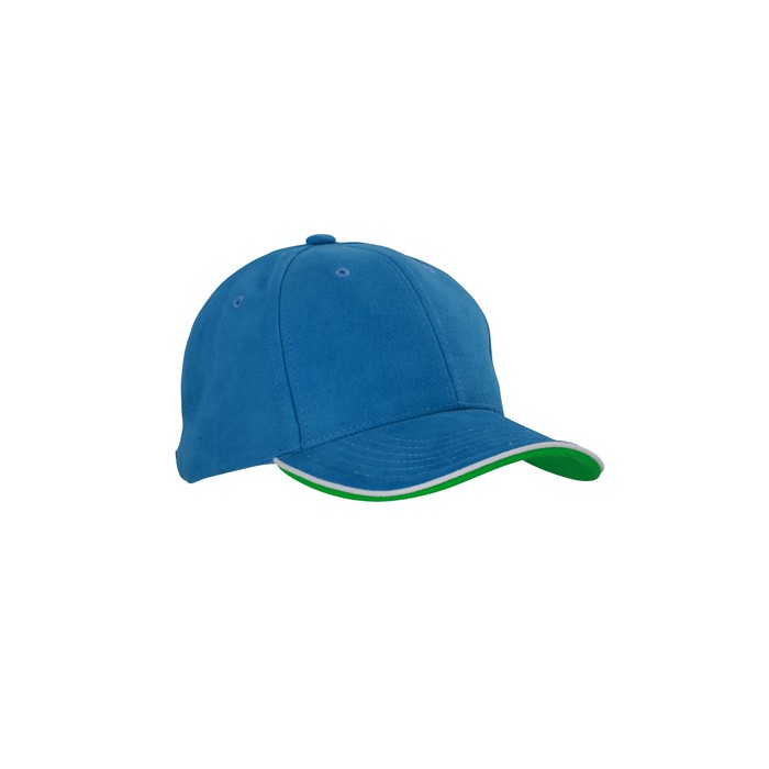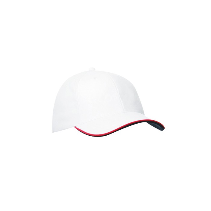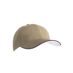 6-panel cap with double sandwich | Highly brushed cotton | Clip buckle in matt silver with contrasting piping and embroidered eyelet | Six embroidered air holes | Six decorative stitching lines on the visor | Contrasting lower peak | Front panels laminated | Padded satin sweat band