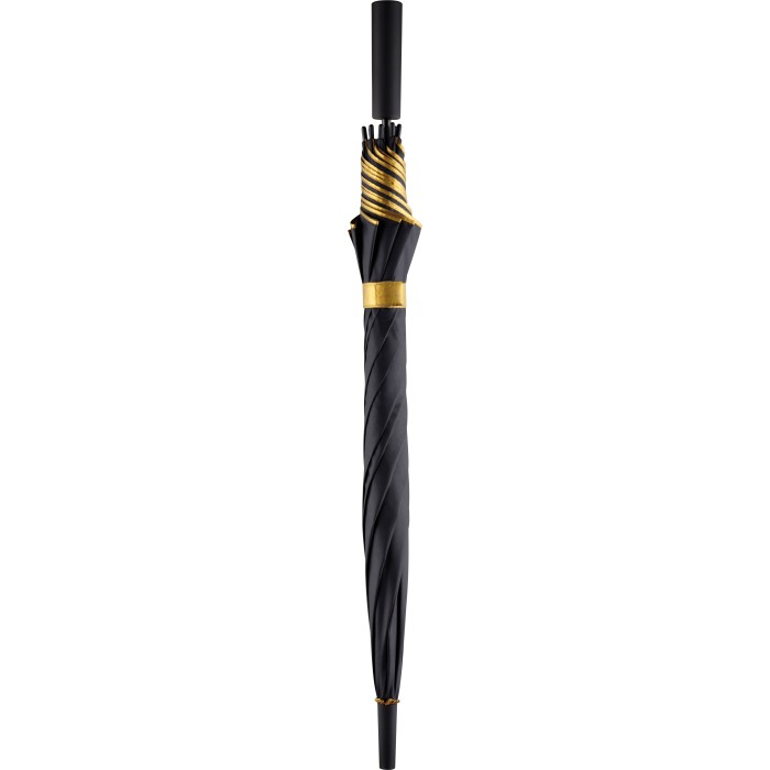 Convenient automatic function for quick opening | Windproof features for higher frame flexibility and improved stability in windy conditions | Flexible fibreglass ribs | Two-tone canopy with coordinated interior and exterior colours | The colour of the hem, rosette and fastening strap is matched to the interior colour of the canopy | Canopy coated on the inside | Straight soft-touch handle with dual promotional labelling option | Higher corrosion protection due to black electroplating of the steel shaft | Plastic handle