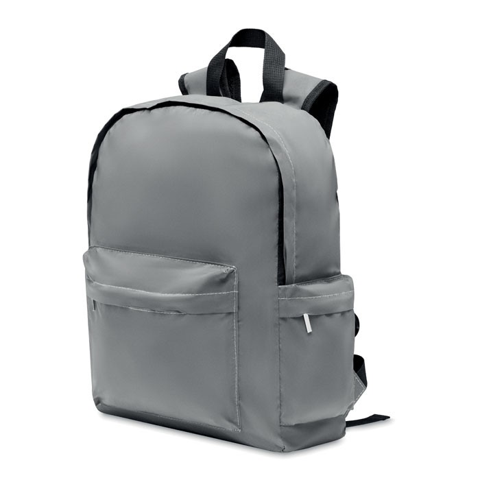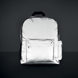 Backpack in high reflective 190T polyester and straps. It has 15 inch padded laptop compartment. Front zippered pocket, one side mesh pocket and other side zippered pocket. For comfort a padded back section in 600D recycled polyester.