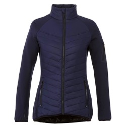 Banff hybrid insulated ladies jacket | Global fit | Centre front contrast reversed coil zip | Chin guard | Contrast coloured binding at bottom hem | Reflective detail | Easy grip zip pullers | Printed main label | Interior media exit port with cord guide | Zipper garage on pockets | Nylon dull cire 380T, water-repellent and downproof