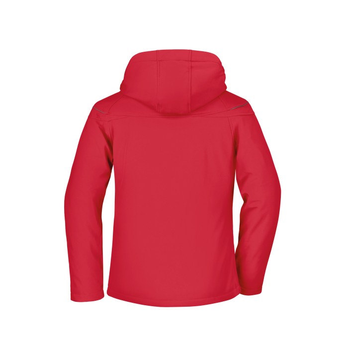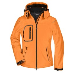 Fashionable winter softshell jacket for ladies | Functional 3-layer-fabric with TPU membrane | Wind- and waterproof (5000 mm water column), breathable and permeable to vapour | Seams not sealed | Detachable, padded and lined hood | Warming fleece collar | Zip under the sleeves for additional ventilation, long wind protection | Reflective piping on shoulder and front pockets | 2 front pockets, 1 breast pocket, inside breast and mobile phone pocket | 2-way zip | Elastic cord with stoppers on waistband and hood | Slightly fitted | Zip for decoration at the back