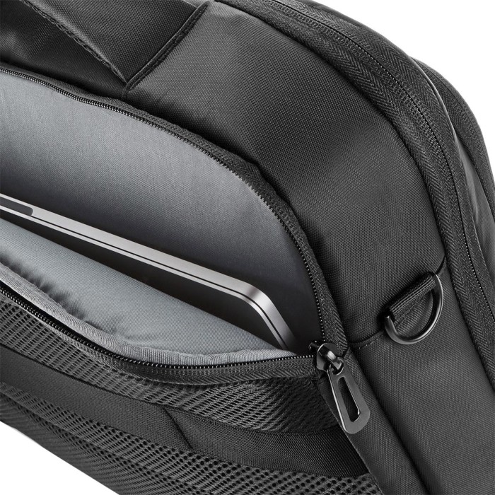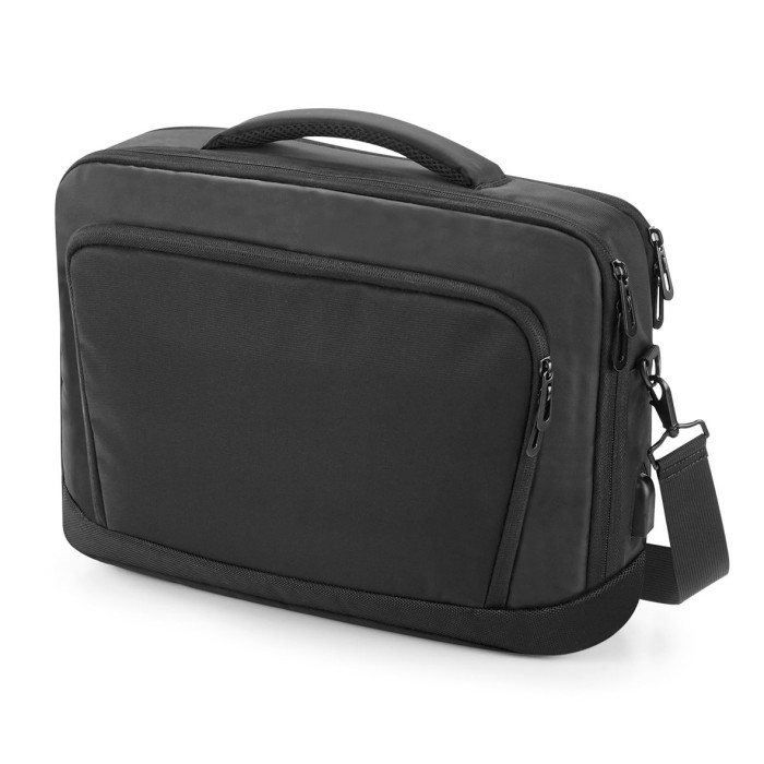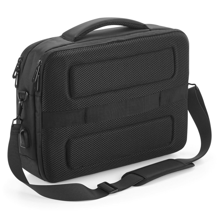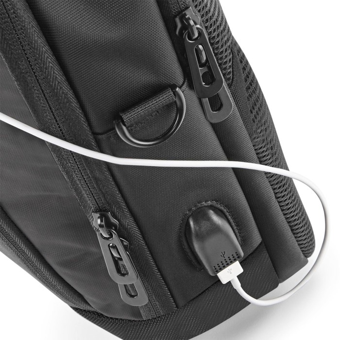 Jacquard Nylon/ PU Coated Polyester Combination | TearAway label for ease of rebranding | Laptop compatible up to 15.6“ | External access padded laptop compartment | Padded internal Tablet compartment | Front pocket organiser section | Power bank pocket | Integrated USB charging port | Elasticated cable organiser | Zippered internal valuables pocket | Key hook | Wheelie bag strap | Detachable adjustable shoulder strap | Delivery without content / decoration | Capacity: 13 litres