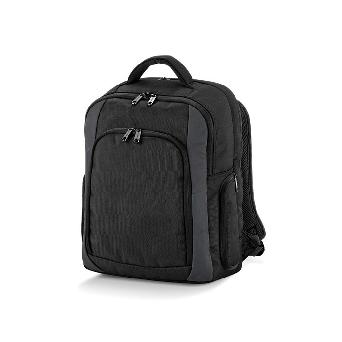 1680D Polyester | Padded laptop section | Front pocket organiser section | Padded adjustable shoulder straps | Laptop compatible up to 15,6“ | Media pocket & headphone port | Water bottle holder | Zippered side pockets | Grab handle | Capacity: 23 litres | Delivery without content / decoration