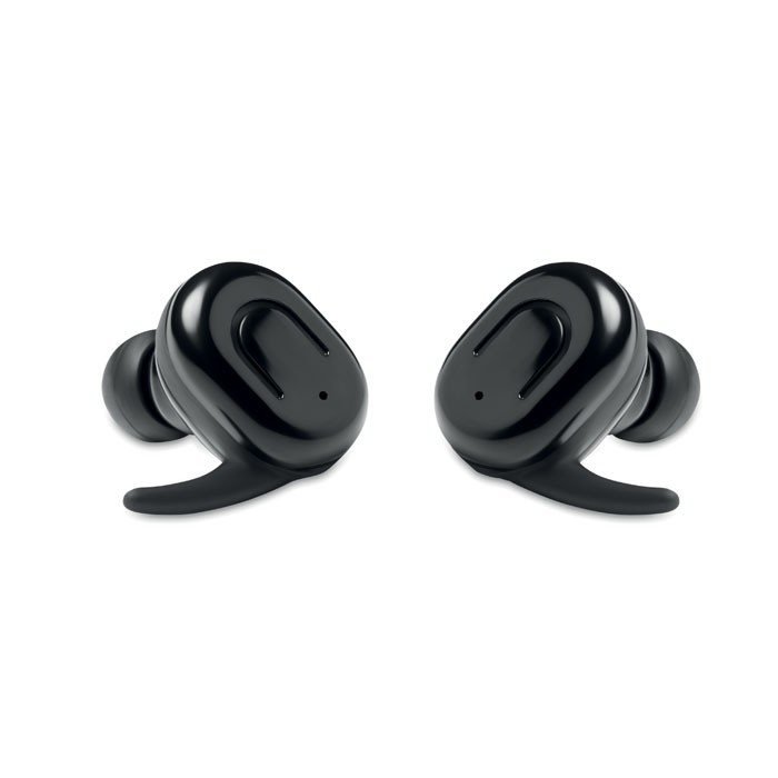 Set of 2 wireless TWS 5.0 wireless stereo earphones with 45 mAh battery build-in. Playing time approx. 3 hours. Including a micro USB charging cable. Presented in box which also acts as a charging station with rechargeable Li-ion 250 mAh battery.