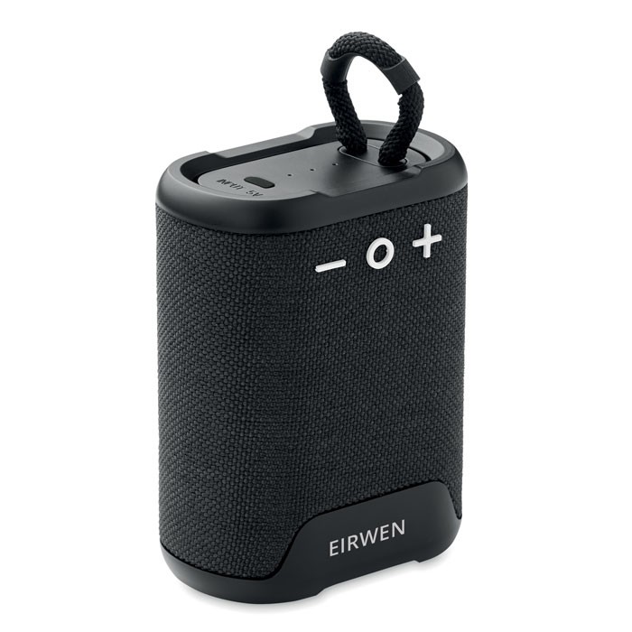 5.0 wireless speaker in ABS with 30 % hemp and 70% polyester fabric finish, IPX7 splash proof with handle. 1 Rechargeable Li-Ion 1800 mAh battery. Output data: 5W, 4 Ohm. Playing time approx. 8h.