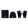 3-częściowy zestaw zimowy. Zawiera czapkę z materiału RPET, szalik i rękawiczki dotykowe z etykietą do nadruku.