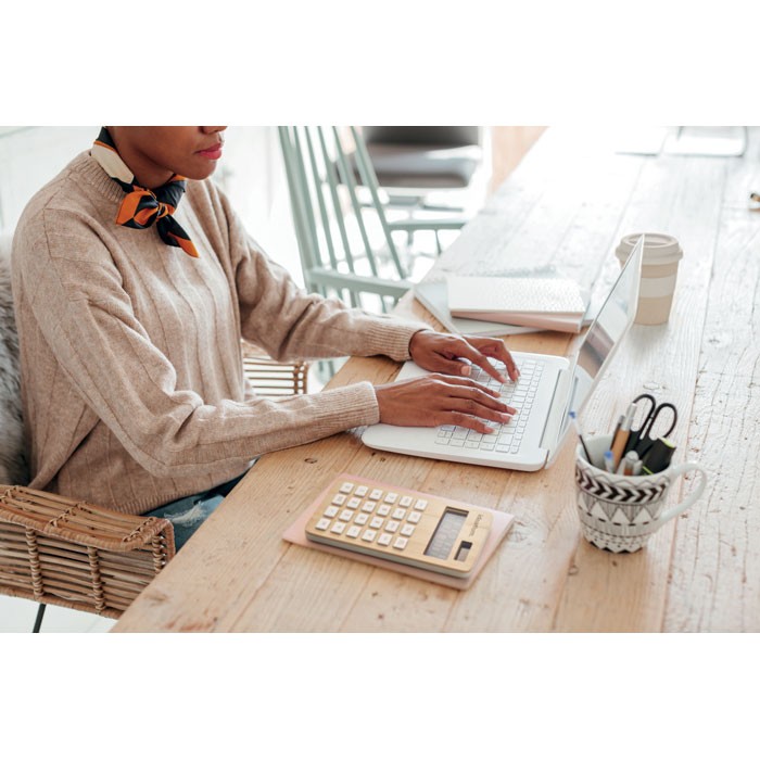 8-cyfrowy kalkulator z podwójnym zasilaniem, ABS, bambusowa obudowa. W zestawie 1 bateria (LR1131). Bambus jest produktem naturalnym, dlatego mogą wystąpić nieznaczne różnice w kolorze, wzorze i rozmiarze.