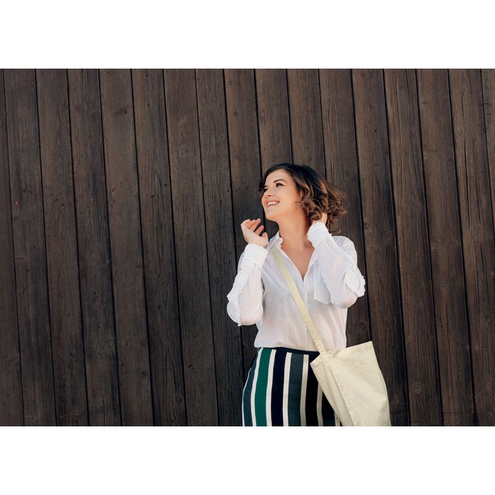Bawełniana torba na zakupy z jednym długim uchwytem. 140 gr/m². Wyprodukowana zgodnie z certyfikowanym standardem stosowania szkodliwych substancji w tekstyliach.