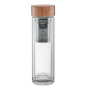 Butelka z podwójnymi ściankami, ze szkła borokrzemianowego, z bambusową pokrywą, z zaparzaczem do herbaty 400ml. Bambus jest produktem naturalnym, dlatego mogą wystąpić nieznaczne różnice w kolorze, wzorze i rozmiarze. Szczelna. Grawerowanie laserowe nie jest możliwe na szkle borokrzemowym.