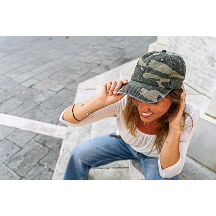 Nieusztywnione panele przednie | Daszek średniej wielkości | Regulacja szerokości za pomocą metalowej klamry | 6 obszyte oczka wentylacyjne | Bawełniana opaska pochłaniająca pot | 8 przeszyć na daszku | Wstępnie wyprany