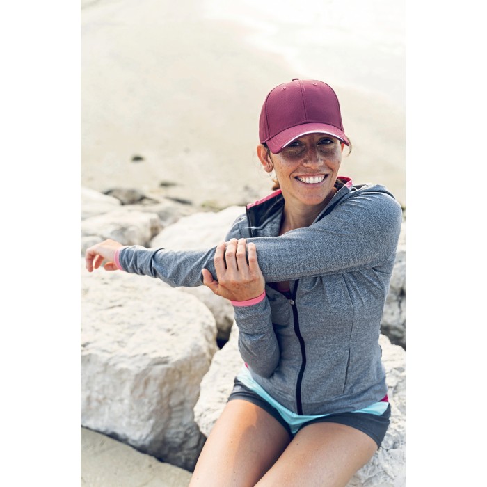 6 paneli | Obszywane oczka | Panel czołowy usztywniony | Lamówki | Wstępnie zakrzywiony daszek | Zapięcie na rzep | 4 przeszyć na daszku | Poliestrowa taśma pochłaniająca pot | Żakardowa tkanina poliestrowa