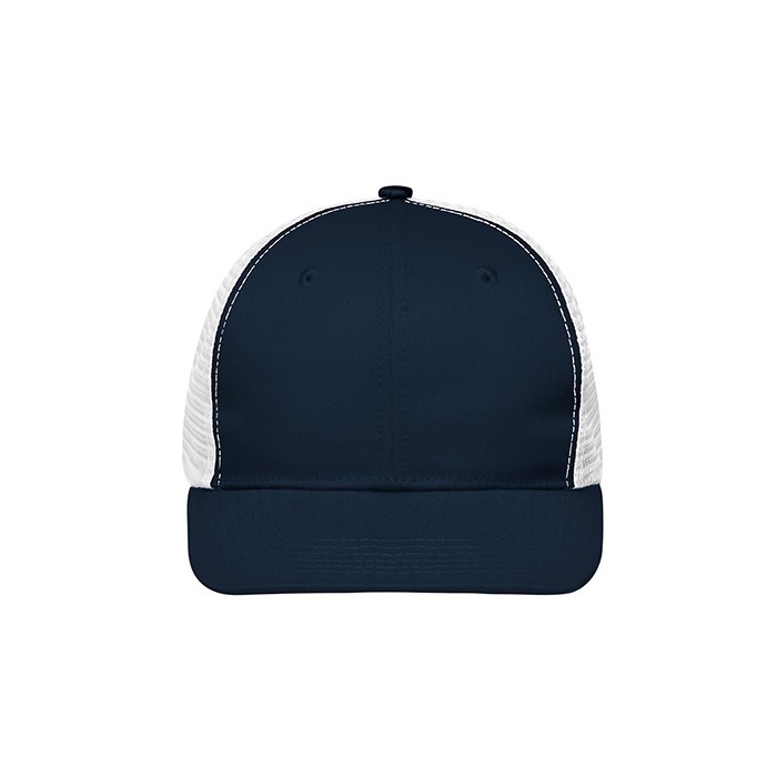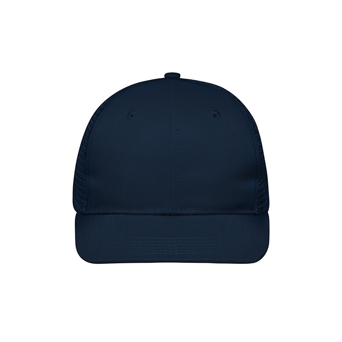 Modna 6-panelowa czapka siateczkowa z płaskim daszkiem z tkaniny poliestrowo-bawełnianej | 8 dekoracyjnych szwów na daszku | 2 haftowane otwory wentylacyjne na panelu przednim | Taśma pochłaniająca pot | Zapięcie snapback | Przedni panel: laminowany