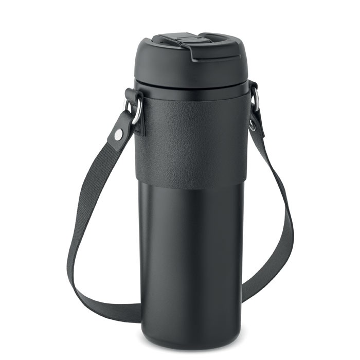 Dwuścienny, malowany proszkowo kubek ze stali nierdzewnej z pokrywką z PP 2 w 1 i paskiem z PU. Szczelny. Pojemność: 700 ml.