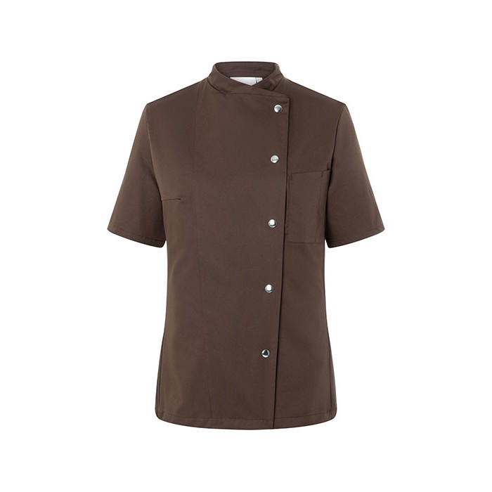 Twillowy materiał, 215 g/m² | Wykończony szlachetną apreturą, dekatyzowany, trwały w kolor, łatwy w pielęgnacji | Damska kurtka szefa kuchni | Zaszewki na klatce piersiowej | Krótkie rękawy | Kieszonka z lewej strony klatki piersiowej, z kieszonkami na długopis | 5 zatrzasków, 1 zatrzask kryty | Możliwość prania przemysłowego | Możliwość prania w temp. do 95°C